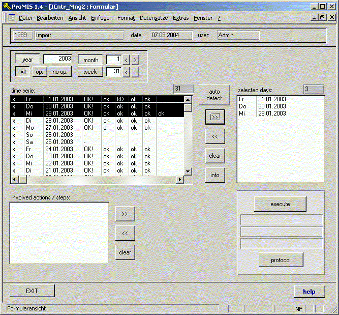 ProMIS provides a very fancy mechanism to import external data. These procedures might have some complexity and are hence subject of configuration. The advantage of this approach is that even complex situations can be handled without annoying the user with unnecessary requests or prompts. Furthermore adjustments to the procedure (e.g. due to new acquisition devices or software) can be made "in the background" so that the user will still act the same way he was used to. Basically ProMIS accesses data in several ascii-formats as well as database and ODBC--data sources. A noteworthy feature is that the status of the data imported (e.g. ok, minor problems, missing data, inconsistencies, etc.) is available at one glimps, and in addition complemented by a reporting system which helps to detect and identify the actual problem.