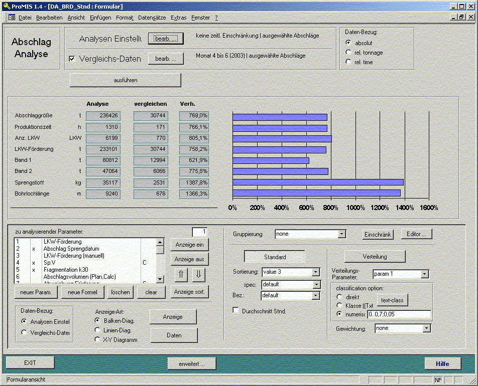 Wie der Name vermuten läßt, sind Standard-Analysen für den täglichen Gebrauch gedacht. Die Einschränkungsmöglichkeiten beziehen sich auf einfache Zeit- oder Geometriebegriffe und sind so leicht festzulegen. Typischerweise beinhaltet die Analyse eine Vergleichsbasis (z.B. Vergleich des laufenden Monats mit dem vorigen, oder dem vorherigen jahr, etc.). Ausgewählte Daten werden unmittelbar angezeigt und graphisch dargestellt. Man kann aber auch sehr leicht auf die zugrundeliegenden Daten zugreifen. Beispielsweise kann man die Sprengstoffverbräuche einzelner Abschläge anzeigen um eventuelle Auffälligkeiten in der Gesamtsumme erklären zu können. Die Datenauswahl ist aber in einem gewissen Grad beschränkt und werden zum Teil in der Konfiguration voregegeben. Dennoch ist diese Stufe bereits sehr mächtig und inkludiert auch die Möglichkeit eigen Berechnungen mit den Daten festzulegen.