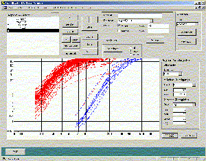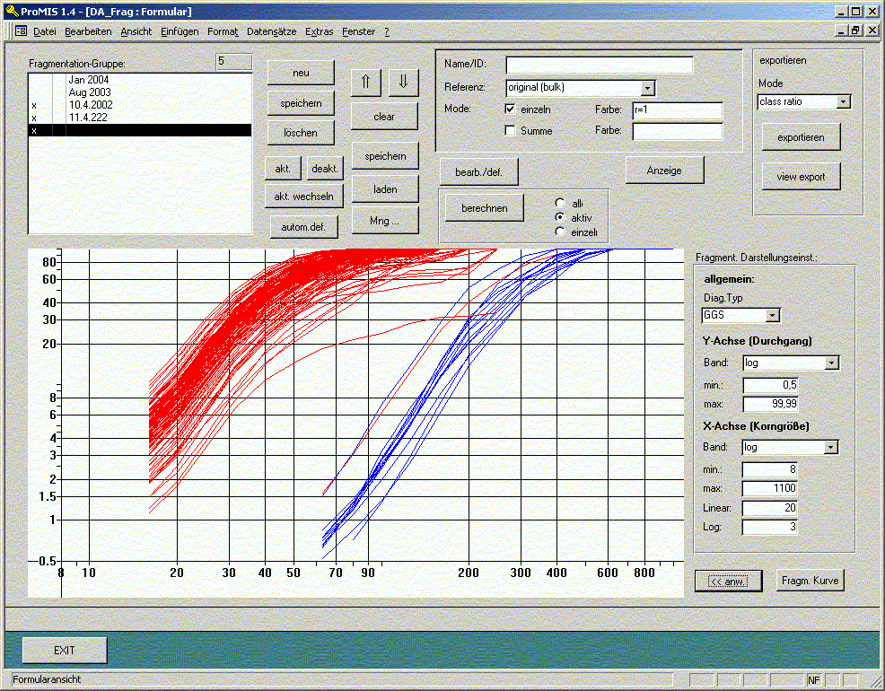 In dem Beispiel rechts ist eine Anaylse-Bereich für Korngrößenmessungen zu sehen. Es können verschiedene Messungen gewählt, gruppiert und angezeigt werden. Es können aber entsprechende Kennwerte wie Summenkurven oder Durchgangswerte berechnet werden.