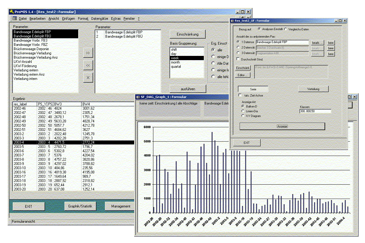 Dies ist die allgemeinste und universellste Form der Analyse. Jegliche Daten innerhalb des Systems können ausgewählt und verarbeitet werden (vorausgesetzt daß irgend eine logische Verbindung zwischen diesen besteht). Die Daten können auf einem höheren Niveau zusammengefaßt werden, wodurch nahezu für alle Daten eine geeignete Verbindungsebene gefunden werden können und derart in Verbindung zueinander gebracht werden. Es bestehen umfangreiche Möglichkeiten in die Art der Zusammenfassung einzugreifen. Auch hinsichtlich der Datenauswahl ist in Form eines Abfrage-Editors, welcher auch komplexe Abfragen mit logischen Verknüpfungen und Klammersetzungen abzubilden vermag, größtmögliche Flexibilität gegeben. Diese ist u.U. notwendig um erkannte Ausreißer von der Analyse auszuschließen. Graphische Darstellungen und Exportmöglichkeiten der Ergebnisse komplettieren das Leistungsangebot.